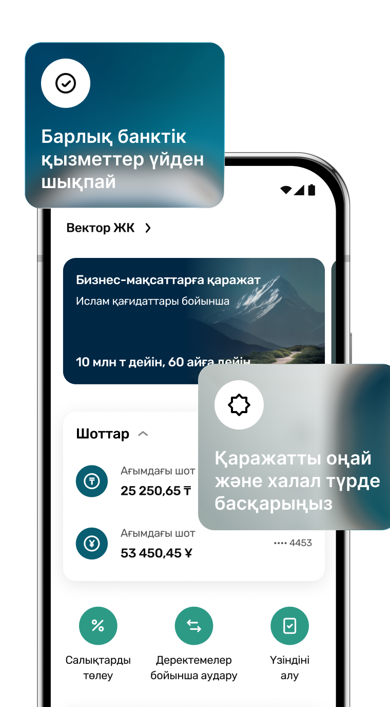 Сіз біздің өнімдерді дінге қарамастан пайдалана аласыз. Ислам банкингі - бұл клиенттің діні туралы емес, принциптер туралы: адалдық, ашықтық және құрмет. Біз пайыздарды (риба) алмаймыз, жасырын шарттарды қолданбаймыз және күмәнді салаларға инвестиция салмаймыз. Біздің барлық шешімдеріміз нақты экономикаға, әділ серіктестікке және сенімге негізделген.